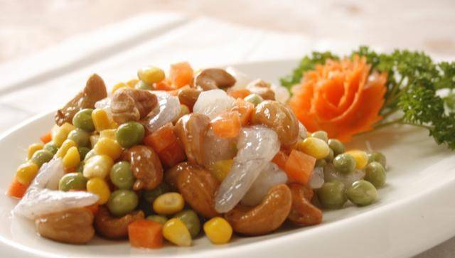 3、炒锅烧热少许油,将姜末爆香,先倒入胡萝卜丁翻炒至七八熟,再加入玉米粒、腰果和黄瓜丁翻炒。最后加盐和鸡精调味即可上桌。