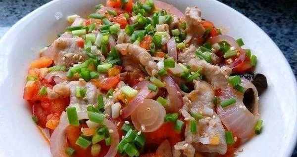 3.倒入切丁的西红柿和切圈的洋葱翻炒,加少许水让西红柿粘稠,加入鸡精、盐、糖拌匀,淋上里脊肉,撒上葱花。