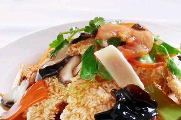 5、另一锅放植物油,烧热至80%,倒入稻壳炸至金黄色,捞出装盘,上面淋少许滚油,放入豌豆苗在上面发球。配上肉片汤,趁热上桌,将肉片和汤汁浇在锅巴上即可上桌。