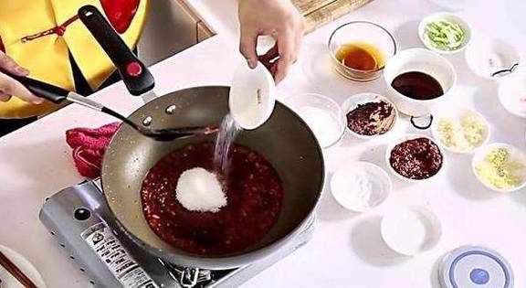 就可以倒出来了,这个时候我们的锅内留有半勺的底油,下入蒜末,姜末,爆香即可,然后,就可以下入半勺豆瓣酱,一勺泡椒酱,慢慢的炒制给它炒出红油,炒制的过程中不仅可以去除豆瓣酱的生豆瓣味,而且还可以增加它的外观颜色,接下来在锅中加入一勺料酒,一大勺米醋,一大勺白糖,米醋和白糖的比例大约是一比一,这个时候我们再少来点酱油,半勺鸡精,这时候再来一点儿老抽,调一下它的颜色,