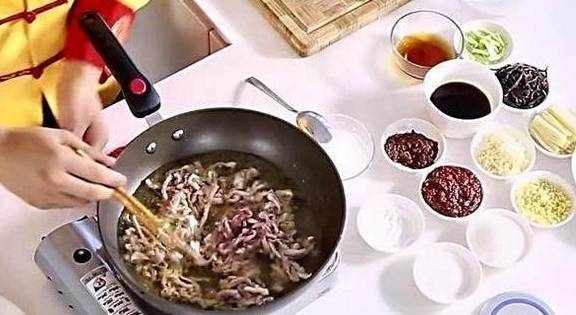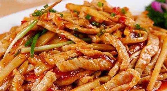 等到油温已经升到三成热时,把刚才上好浆的肉丝轻轻地倒入锅里,等到肉丝下锅之后,不要迅速地去搅动它,停留大约十秒钟,当肉丝稍稍有凝结现象之后,再用筷子轻轻地滑散,等到十秒钟过后,拿着筷子把肉全部滑散,这个过程当中你会发现肉丝已经渐渐的变色,炒的过程油温不宜过高,继续保持三成左右,等到到肉丝滑熟之后,再把炒好的笋丝、木耳丝放入油锅当中,把它们加热了以后,
