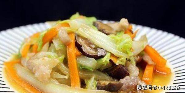 做法:1、将所有材料洗净,切条备用,瘦肉丝提前用少许油、生粉、盐拌匀;油锅烧热,倒入瘦肉炒至变色,备用;重新加热油,加入切碎的胡萝卜,炒至变软;加入白菜丝,煮软;
