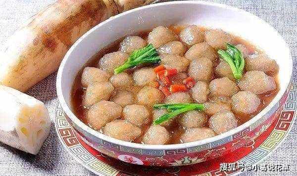 2.把拌好的肉末挤成数只小肉丸,粘滚上藕粉,入开水锅中汆熟,捞出再次粘上藕粉再汆熟,如此反复数次,终成藕丸。