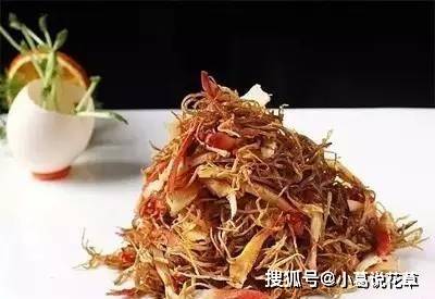 1、把北极贝唇切成丝备用。另把茶树菇撕成细丝,投入六成热的油锅炸至干香,捞出来沥油后,晾冷待用。