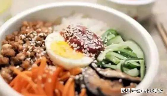 6.把热饭放在碗底,把炒好的蔬菜和肉末放在上面。淋上香油,加入辣酱,撒上芝麻拌匀。