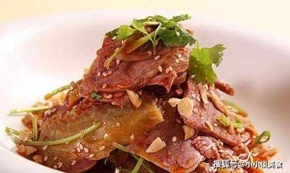 4、将冷却后的牛肉、牛杂切成片,拌匀,淋上酱汁拌匀,装盘,淋上炸花生、香油即可食用。