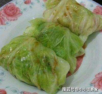 3、卷心菜叶~用白醋和少许盐在沸水中焯至变软~捞出沥干水分待用。