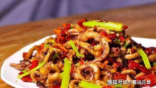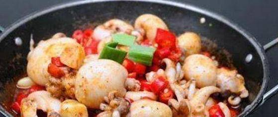3、锅中放入烧开的植物油,烧热。加入豆瓣酱炒香后,加入干辣椒块和花椒爆香,再加入青椒块、小葱和茶树菇一起炒香,加入新鲜章鱼条加盐、酱油、味精和鸡精拌匀后食用。