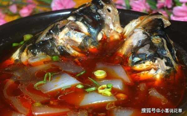 3、锅烧热,加入熟猪油烧至50%,将抹好酱油的鱼头放入锅中煎至两面微黄,加入葱、姜片、绍酒、酱油、糖和1000克水。用水没过鱼头,用大火煮沸。当眼睛变白时,倒入面条,再煮2分钟。入,稍炒,将煮熟的猪油倒入锅中,盛入汤碗中即可食用。