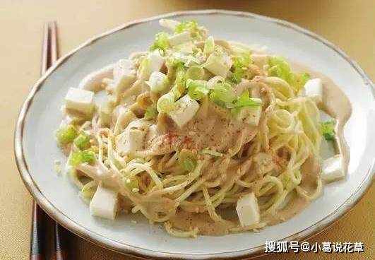 3.把芝麻豆腐酱淋在面条上,然后撒上豆腐丁和切碎的芹菜。