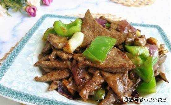 3、热锅冷油,放入姜片、芝麻椒、猪肝快速炒匀,加入适量老抽上色,炒匀后加入蒜苔、芝麻椒翻炒;