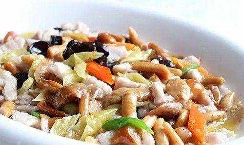 配料:松子50克,香菇500克,葱姜油100克,鸡油5克,盐和味精4克,白糖25克,湿淀粉15克,白糖少许色、鸡汤250克。
