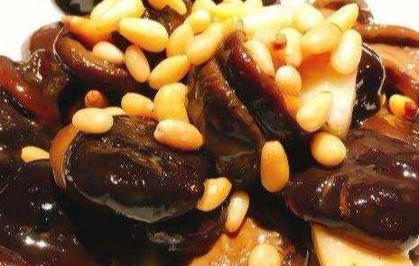 2、用炒勺烧热葱姜油,将松子炒香,加入鸡高汤、料酒、白糖、盐,用白糖将汤调至金黄色,加入味精和香菇,炒香。小火慢炖15分钟。用稀释的湿淀粉稀释,倒入鸡油即可食用。