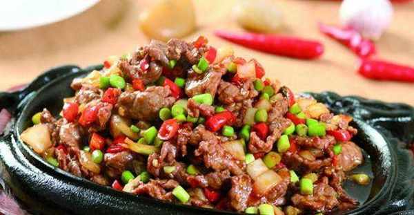 2、两汤、白糖、生粉5克、味精调匀成酱汁;锅内留10克色拉油,70%热时加入蒜片、葱、姜片、辣妹酱和蚝油,加入牛肉,芡汁大火炒匀,加入香脆辣椒,芝麻,烤花生,大火炒匀,锅中倒出香油,放在烧过10分钟的铁板上高温,葱花。