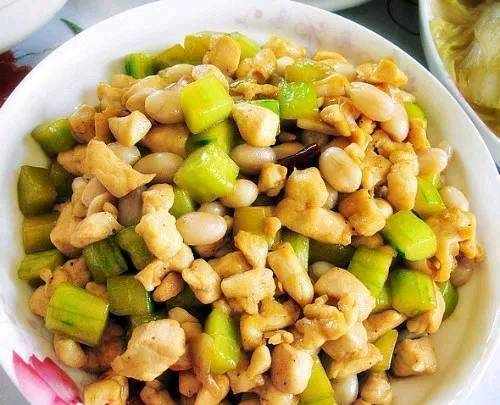 3。等到切好的鸡肉变白后,倒入切好的黄瓜翻炒。