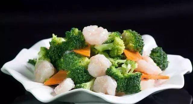 材料:西兰花、胡萝卜、虾仁、料酒、盐、油、蒜