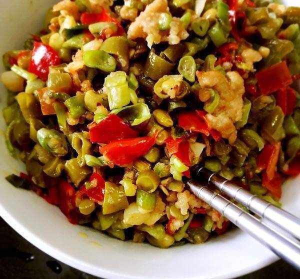 2、豇豆泡发,洗净(如果太咸可以放水里泡半小时),切碎备用。新鲜鹰嘴豆洗净切碎,干辣椒切碎备用。热煎锅,加入油,加入葱、姜、蒜末和干辣椒炒香。