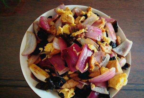 1、洋葱洗净切段拌匀,香菇提前泡发,洗净切小块,鸡蛋打散加少许盐,肉片用酱油腌制。