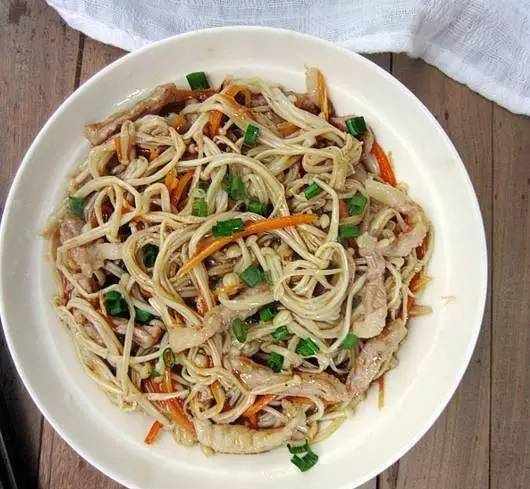 4、余油再烧热,放入金针菇,炒红辣椒片,加盐、酱油调味。