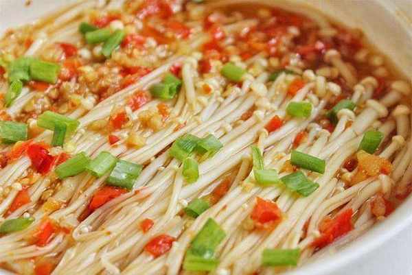 1、金针菇切根,洗净沥干,装盘,将剁碎的胡椒粉铺在金针菇上。