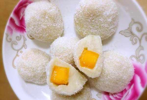 第二步:将芒果去皮切丁;取出蒸好的面团,晾凉至不烫手,取出适量的面团,擀成圆形,压扁,包入适量的芒果丁,然后用手慢慢插入嘴。tiger闭上嘴巴,再揉成一团,卷入椰片里均匀裹上一层椰片,我们的芒果糯米糕就做好了,可以直接吃也可以放冰箱冷藏2小时晚点吃,味道会更好,适合夏天凉拌食用。