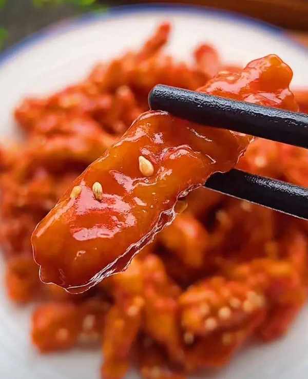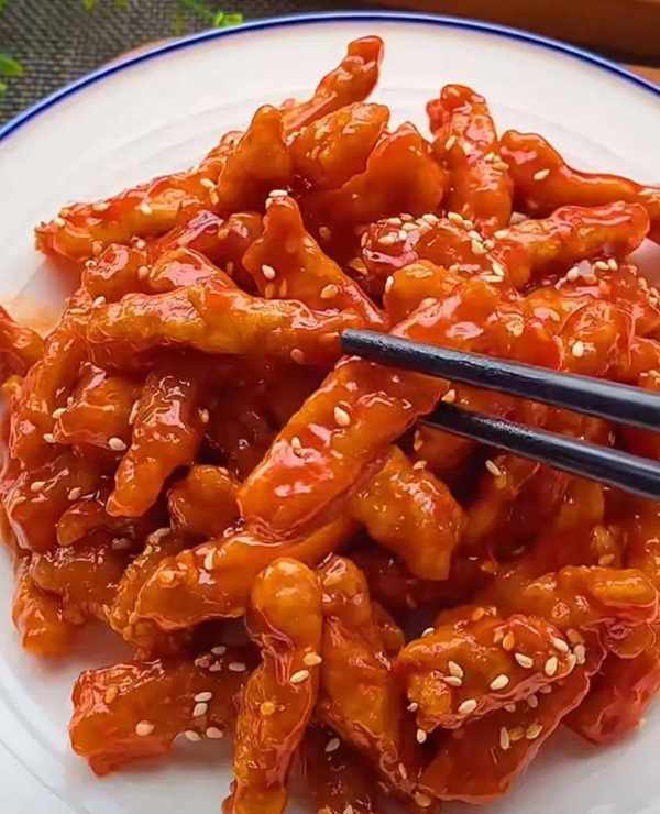 秘密二,里脊肉要一条一条地下入油中,否则会粘在一起,炸黄捞出来。
