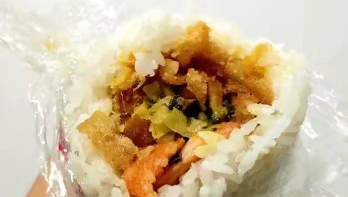 六 .蒸饭包油条 不是每个早餐点都有蒸饭包油条,以至于有时可绕道排队也要带上一份。饭不是很软糯的那种,而是有点硬,颗粒分明,里面包入老油条、很大一个,绝对够大饭量的成年男子吃。气质上有咸口和甜口,老油条捏碎,吃起来又脆又香,其他食材与饭团相融合气质恰到好处,咬一口慢慢洋溢出满足的气息。