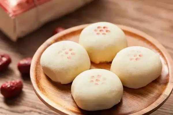 贵妃饼外表圆润如月,饼身上面还点用枣泥做成的花钿,看起来非常好看。轻轻咬上一口,雪白的外皮酥到掉渣,内里的馅心软硬适中,吃起来软糯绵密,直直甜到心里。