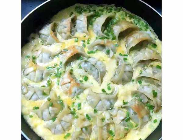 鸡蛋打散,加入蔬菜丁和少许盐,沿着锅边倒入蛋液,均匀地倒在饺子的缝隙中,小火大约3分钟,酥脆美味的锅贴蛋饼就完成啦。