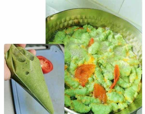 好了,接下来是关键的步骤,将这些糊糊装入裱花袋中。然后烧水做面汤,水开后,将这些糊糊挤到锅中,就会变成类似于疙瘩汤那样的面糊了。