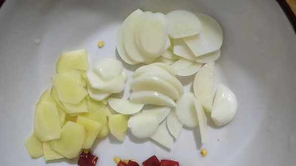 2.生姜去皮切成片,大蒜去皮(如果蒜皮不好去的话,可以在水里泡一会儿,就比较容易剥了)切成片,小米椒清洗干净切成段,全部放入黄瓜条里;
