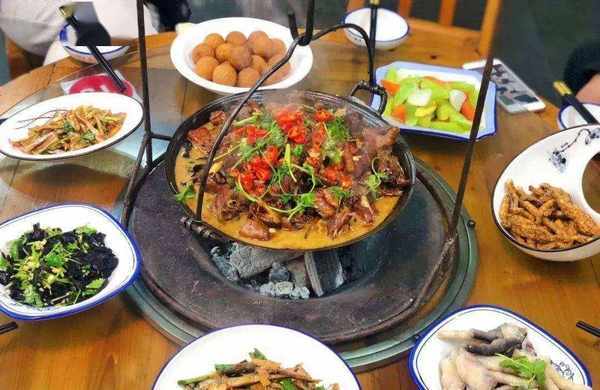 金寨吊锅至今已走过1000年的历史,原来是从农家屋梁在家下木钩,现在改为台式的铁架子,然后同样悬挂上一口铁锅,将鱼、鸡、黄鳝、豆腐、野菜等一锅炖,锅下是点燃的木炭,铁锅中的食物一直都是热乎乎的。