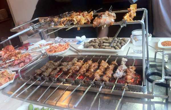 在延吉吃烧烤需要自己动手烤,一口小巧的长铁炉镶嵌在桌子中间,各种食材串成串被直接端上桌,自己动手烤制、撒料等,体会自助撸串的快乐。