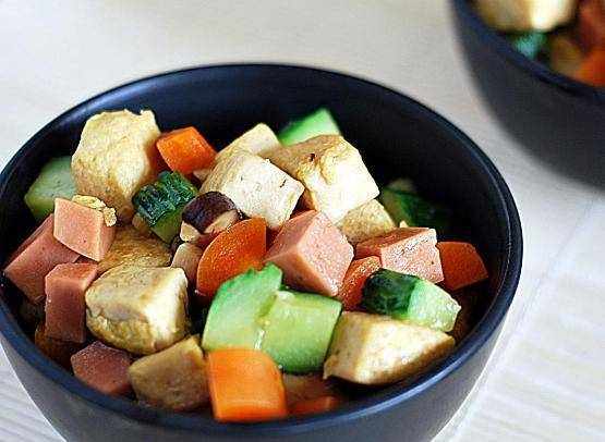 1.将火腿、胡萝卜、香菇、黄瓜等切块。供以后使用;豆腐切成3厘米的方块