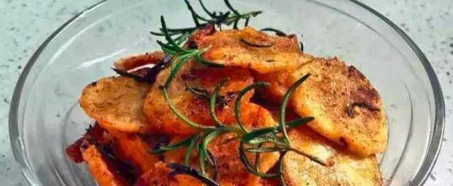 2、将洗净的土豆片用厨房纸擦干,涂上一层油,撒上盐、孜然、辣椒粉拌匀。