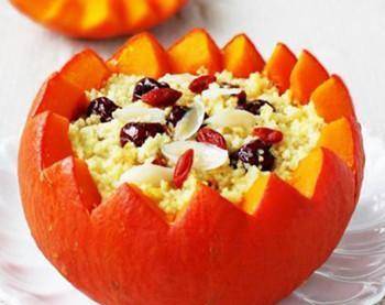 材料:南瓜1个、小米200克、大枣8颗、百合8克、枸杞子20粒