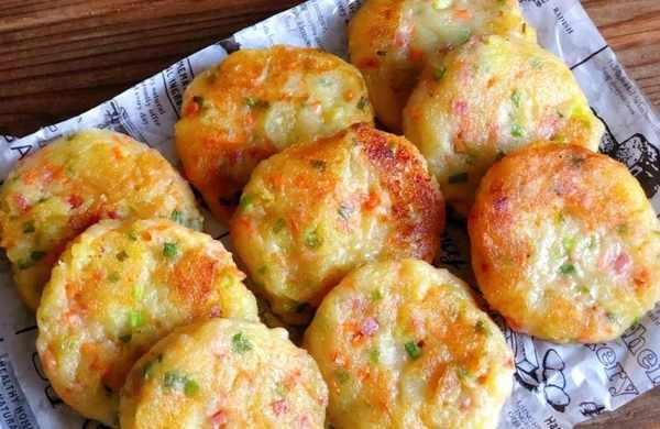 (3)准备土豆饼:将土豆泥、火腿丁、胡萝卜碎、葱花、面粉、十三香、蚝油、食盐搅拌均匀,再取部分泥捏成圆饼状备用。