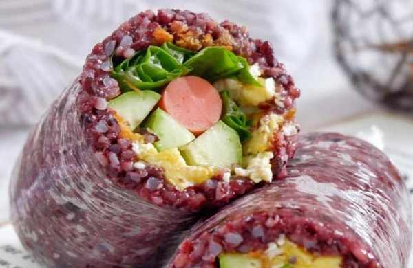 紫米、鸡蛋、生菜、黄瓜、火腿肠、肉松