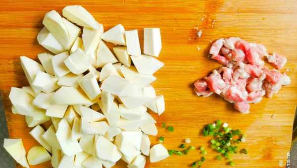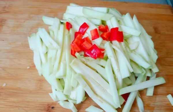 开始制作:1、把茭白的老皮多扒几层,清洗干净切,滚刀块备用