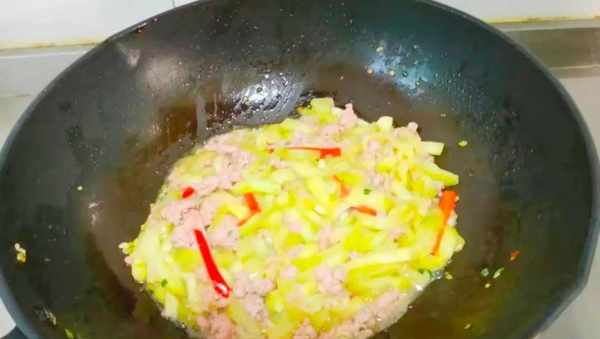 4、再次起锅烧油放蒜片爆香倒入泡好的茄丝和红椒翻炒均匀,加盐,生抽和炒好的肉末少许清水,大火爆炒120秒,最后撒上小葱花就好了