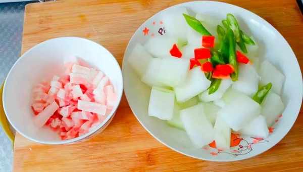 开始制作:1、把冬瓜去皮切均匀的块青红椒菱形块,五花肉切小块备用