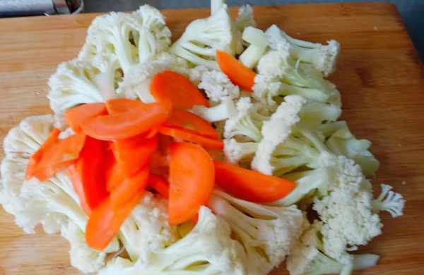 1、把花菜切成小块,红萝卜切成片,