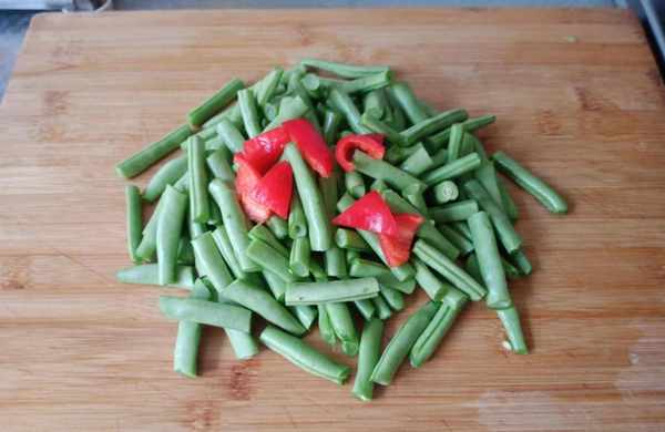 1、把豇豆清洗干净,切两公分的长段红椒切滚刀块备用