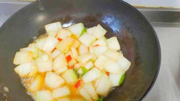 2、起锅烧油,把五花肉煸炒时尚放蒜片包和青红椒爆香倒入切好的冬瓜,翻炒均匀加生抽盐几滴老抽,少许清水盖上盖子炖煮3到5分钟,一道红烧冬瓜就做好了