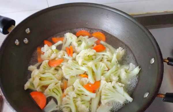 2、起锅烧水,水开后放油和盐,把花菜和胡萝卜焯水备用,