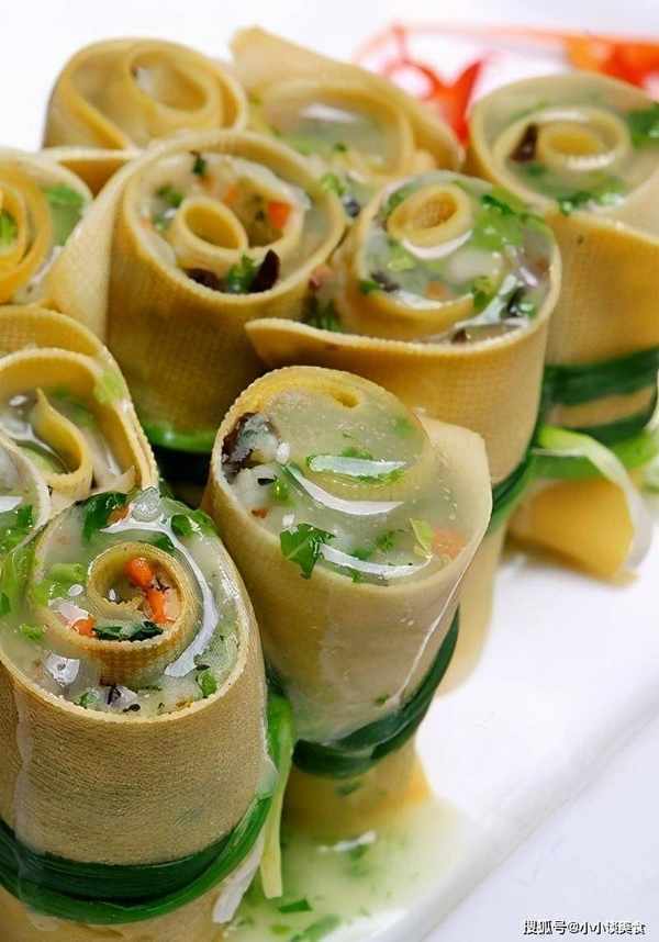 5、锅内放水和盐烧开,水里放少许淀粉调成芡汁,淋在刚出锅的素肉卷上。