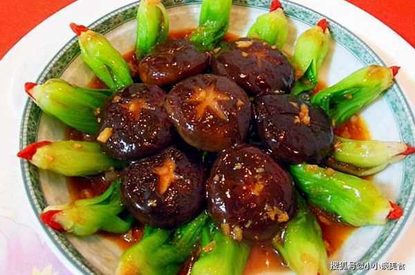 事先做好的象征吉祥星辰寓意的七朵香菇放在油菜花上,再浇上汤汁,美极了!