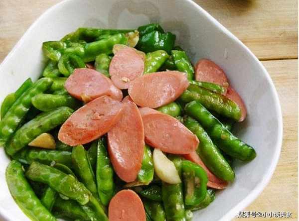 材料:豌豆荚、火腿肠、青椒、蒜瓣、盐、鸡精