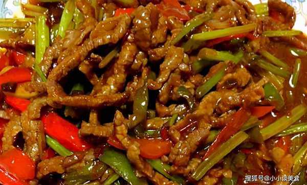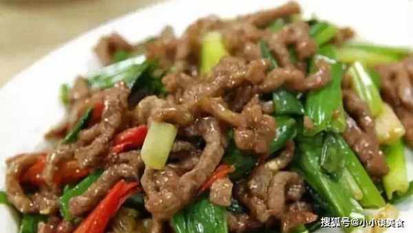 热锅冷油,放入牛排片炒熟,同时加入一小匙料酒。肉变色的时候,如果觉得颜色淡,可以加点酱油调色。多吃酱油,少吃盐,不要太咸!