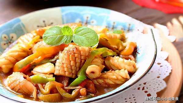 3.加入鱿鱼卷翻炒均匀。加入适量沙茶酱、白胡椒粉和少许水,搅拌均匀后煮1分钟入味。出锅前勾一些水淀粉,滴几滴香油出锅。